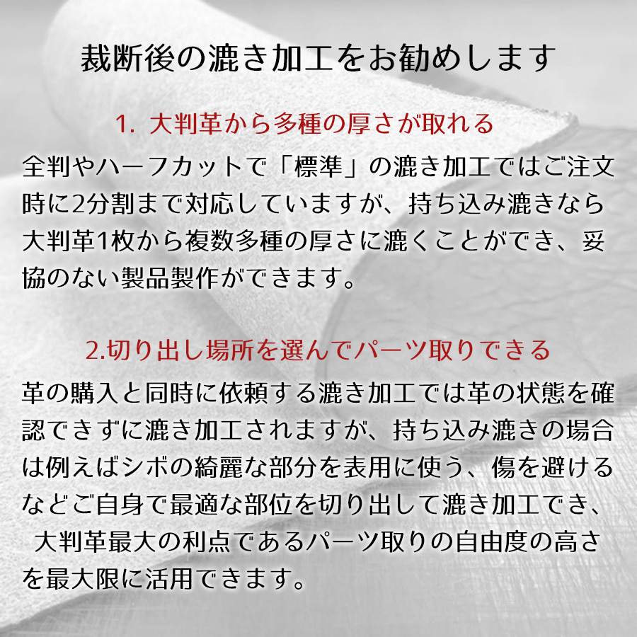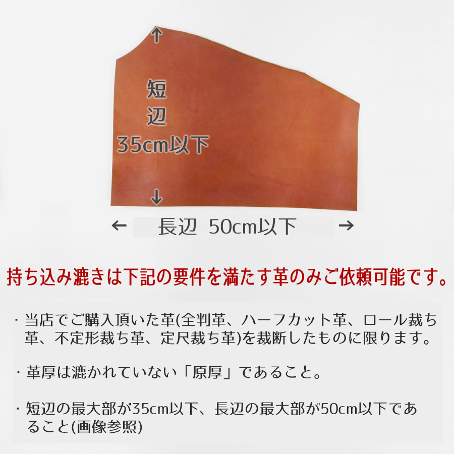 当店でご購入頂いた全判、ハーフカット、ロール裁ち革、定尺裁ち革、不定形裁ち革で漉き加工されていない「原厚」の革が受入可能で、他店購入革および漉き加工済みの革は原則としてお受けできません。
