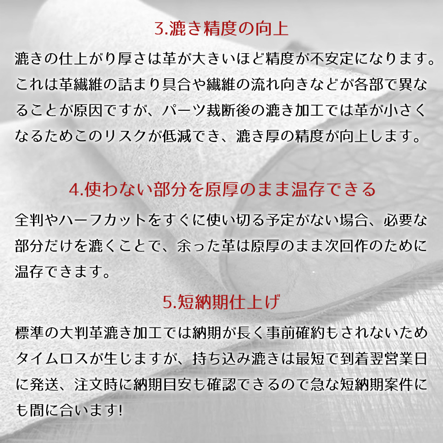 ・依頼は1枚からお受けでき、複数枚の場合革種類や仕上がり厚はばらばらでも大丈夫です。