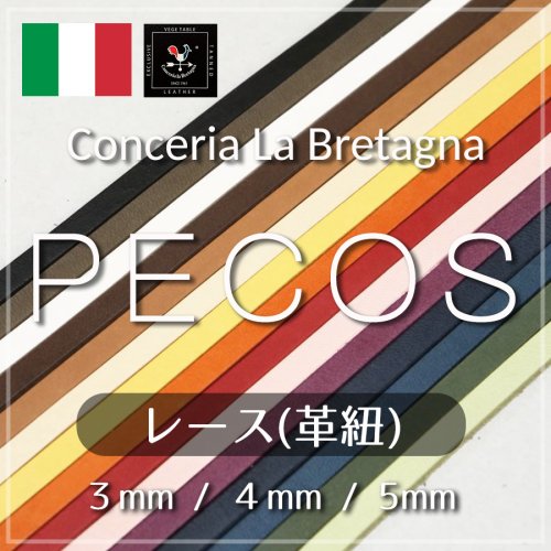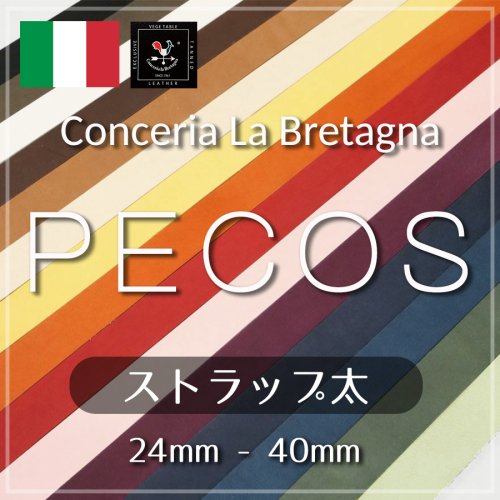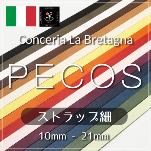 イタリア トスカーナ州のポンテ・ア・エゴラに所在するラ・ブレターニャ社で1961年創業直後から同社の看板として作り続けられている植物タンニン鞣し革です。旧来の「コンチャ・レンタ(スローなめし)」と呼ばれる製法が守られ、ミモザ、ケブラチョ、チェスナットなどの植物から抽出した良質なタンニンと「セーゴ」と呼ばれる獣脂と植物油脂の混合油を用いて50日もの日数をかけてゆっくり丁寧に仕上げられる「PECOS(ペコス)」はクラシックヌメの製法、手触り、香りを現代に伝える数少ない本物の「高品質バケッタ」として認められ、イタリア植物タンニン鞣し協会認証済みです。