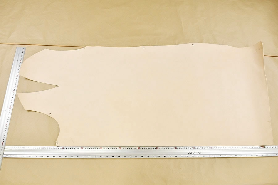 この商品は全判革(ダブルバット)を背筋に並行に面積比1:1で2分割カットした片側を販売しています。