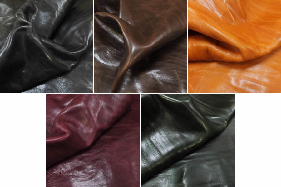 ヌメ革に多量のオイルを含浸させて絞り加工を施したオイルプルアップレザーです。プルアップ効果により絶えず変化する色味の濃淡と絞り加工による皺によりワイルドな立体感が見られ、これにくったりとしたタッチが加わってヴィンテージユーズド感が表現されています。