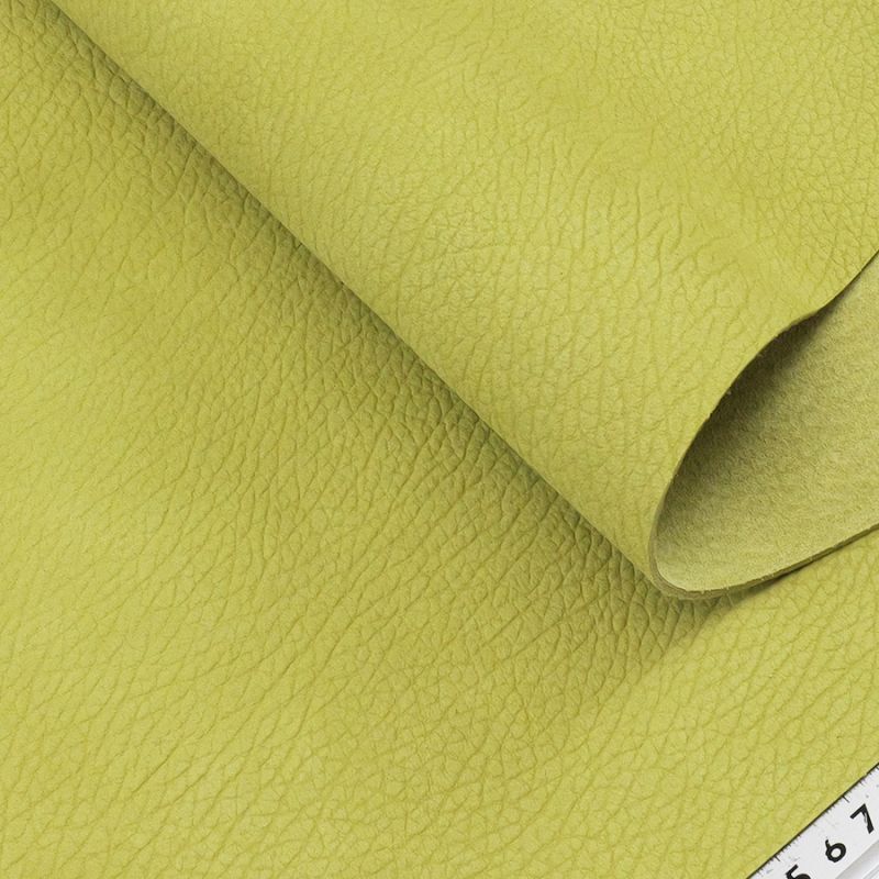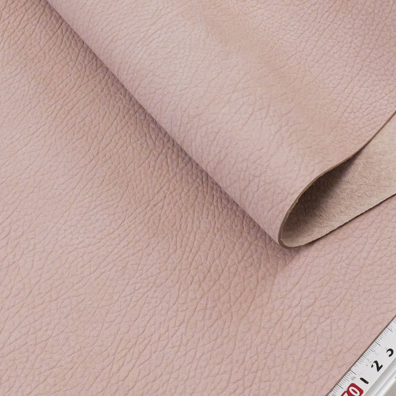 このCURARO(クラーロ)は独自の研究開発によりフルベジタブルなめしでは難度の高いパステル染色とくったりとした柔らかさの両立を実現し、表面はエレファント調のシボを型押しした後にバフを掛けることでヌバックなタッチに仕上げられています。床面はスエード調に起毛処理されていますので1枚革で仕立てる用途にもお勧めです。