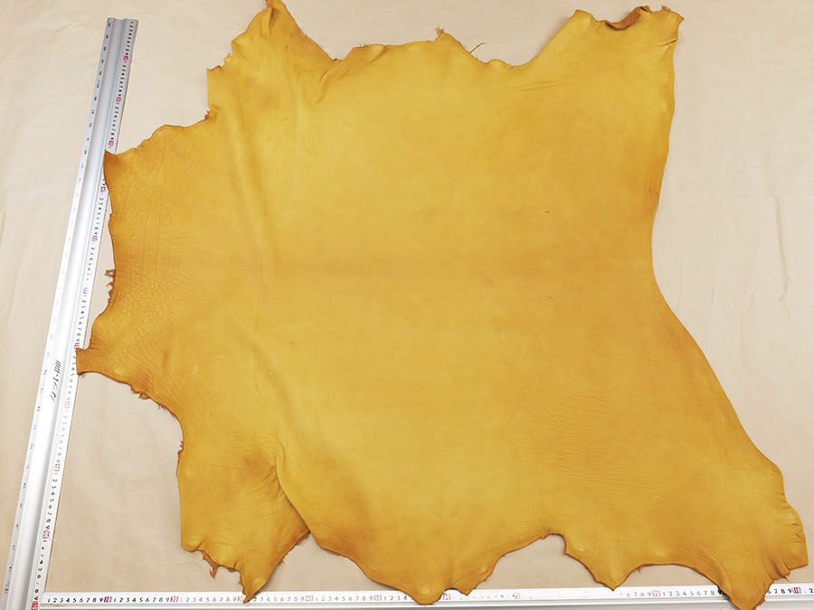 商品詳細欄に記載の原厚、平均サイズはメーカーカタログ記載値またはタンナー公表値ですが、鹿革は牛革以上に個体差が大きく、±60%程度のサイズ差があるほか実厚差もあり、首周りなどは極端に厚いことがあります。