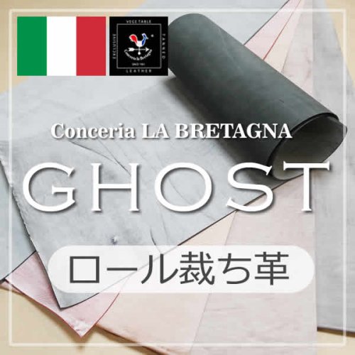 イタリア トスカーナ州のポンテ・ア・エゴラに所在するラ・ブレターニャ社で作られる植物タンニン鞣し革です。旧来の「コンチャ・レンタ(スローなめし)」と呼ばれる製法が守られ、ミモザ、ケブラチョ、チェスナットなどの植物から抽出した良質なタンニンと「セーゴ」と呼ばれる獣脂と植物油脂の混合油を用いて50日もの日数をかけてゆっくり丁寧に仕上げられたクラシックバケッタの表面をホワイトワックスでコートしたユニークな素材が「GHOST(ゴースト)」です。