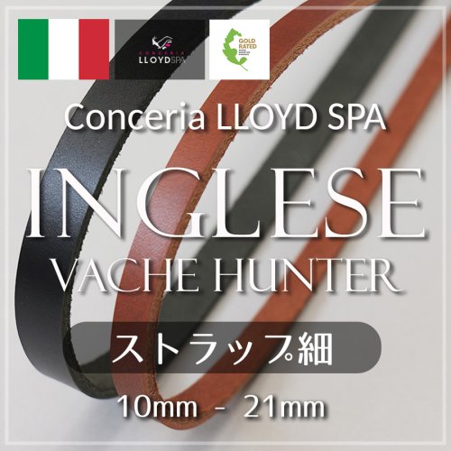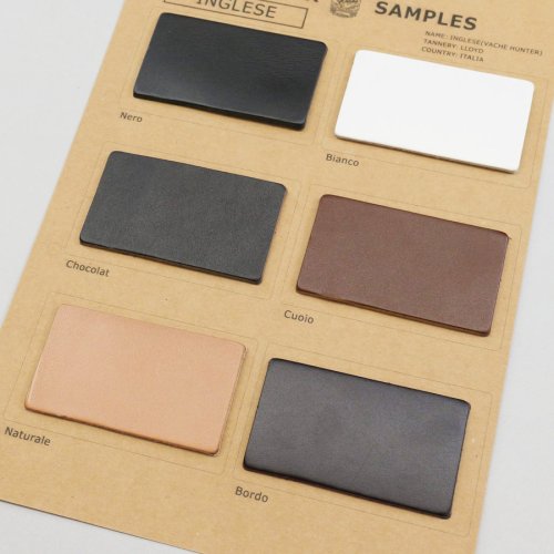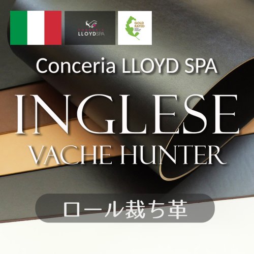 この「Inglese(イングリース)」はヴァッシュハンターという名称で知られている素材で、厚手の成牛原皮の最も繊維がしっかり詰まったベンズ部位に芯まで植物タンニン剤を浸透させることで強いコシが与えられ、手作業での天然ワックス加脂により高い耐摩耗性、引っ張り強度、撥水効果を持たせつつ上品な風合いを醸し出しています。 床面は着色ノリ抑え仕上げ済みですので漉かずに一枚革でバッグハンドルやストラップなどを仕立てる場合は床仕上げの手間が省けます。