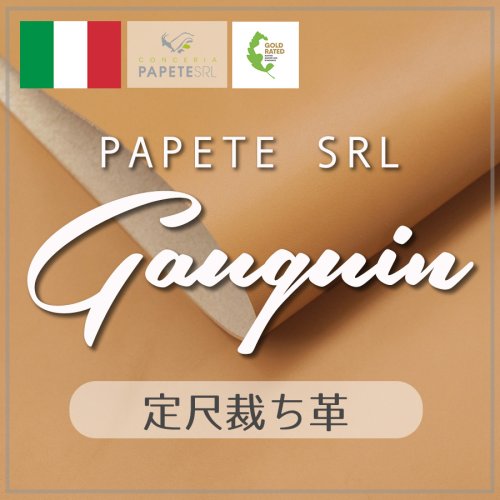 イタリア・トスカーナ州サンタクローチェ地区に所在するConceria Papete SRL(パペテ)社はハイブランド向けのフルベジタブルレザーを製造するタンナーとして知られ、この「Gaouguin(ゴーギャン)」は「LV」製品のストラップや縁部分に使われているもので、肌理の細かいサラリとした肌は水分を吸収しにくい加工も施され、フルベジタブルレザーながら水染みができにくく仕上げられています。