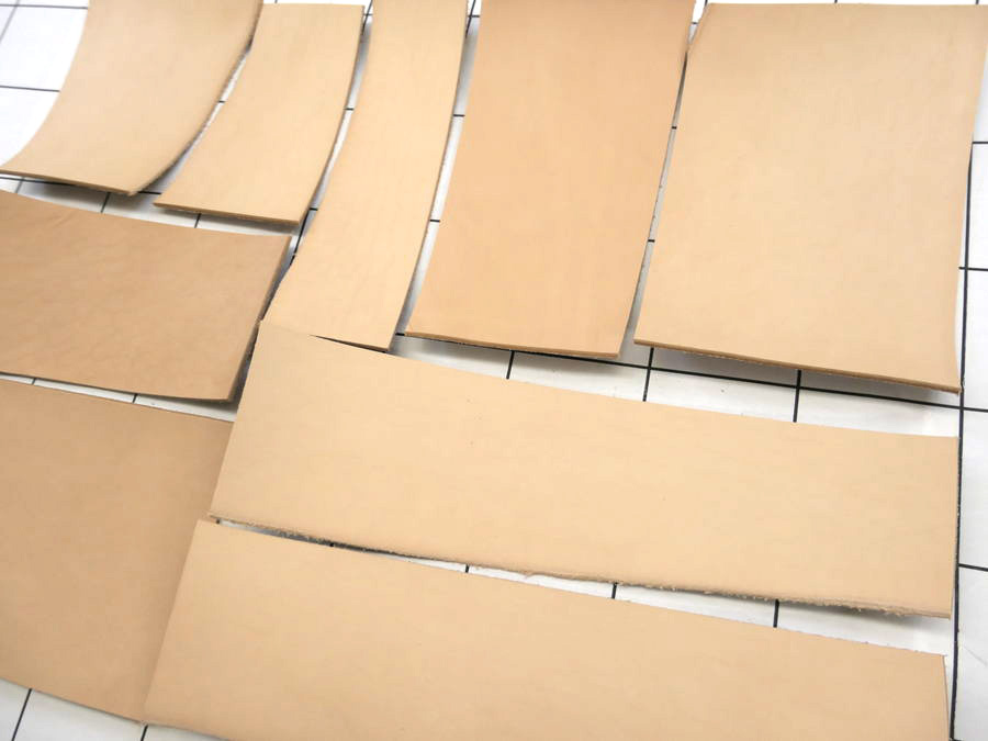 原厚革の裏面は荒肌で厚さも均等ではありませんが、これを原厚より薄い希望厚さにスライスカットする加工を漉き加工といい、弊社では革のご注文の際に漉き加工の手配も承っております。免責事項など加工所の定める受諾条件がありますので詳細は[ご利用案内]の[漉き加工について]をご一読下さい。