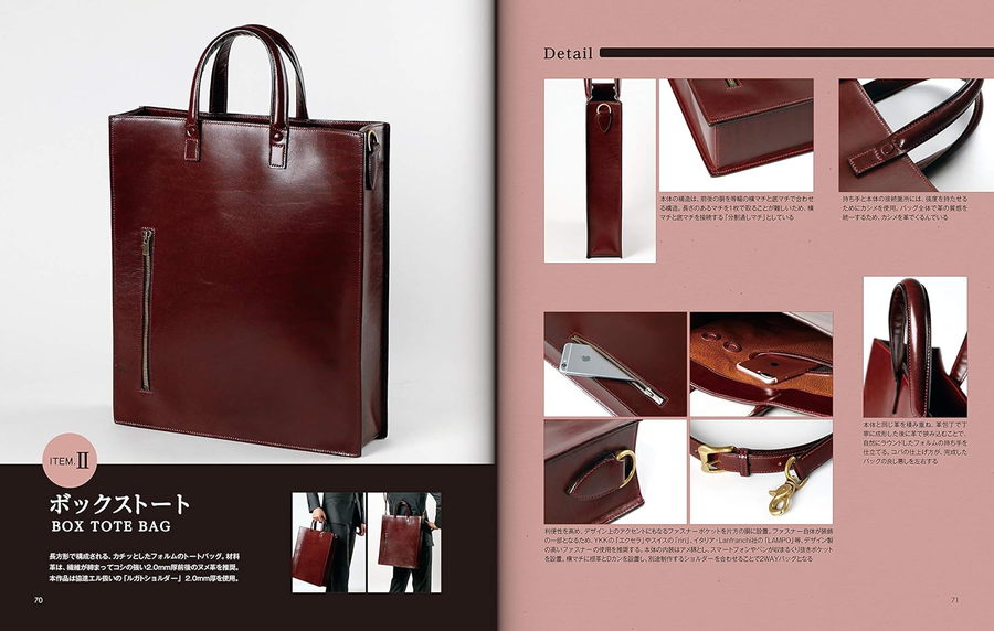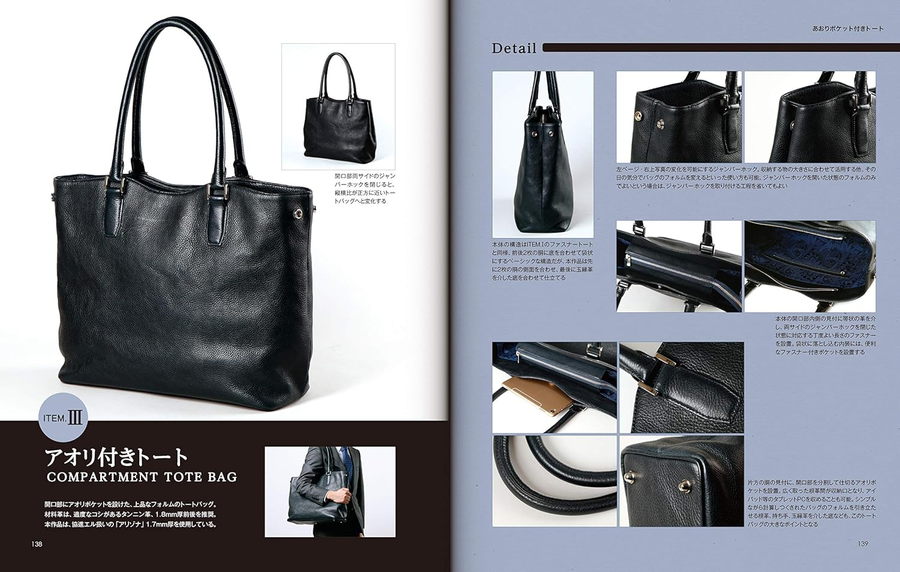 レザーバッグの中でも人気が高く、使い勝手の良い「トートバッグ」。本誌は、口元にファスナーを設けた「ファスナートート」、コシが強い革で仕立てる「ボックストート」、胴の内側に収納部を設けた「アオリ付きトート」、全3作品の作り方を丁寧に解説したレザークラフト上級者向けの1冊です。いずれの作品も、基本構造や根革、持ち手の仕様などが異なり、細かい「へり返し」や「漉き」を多用することで、既成品や量産品を凌駕する本格的なトートバッグに仕上げることができます。本格的なバッグの構造や仕立のヒントを知ることもできるため、レザークラフトの技術を高めたい中級者の方にもおすすめの1冊です。