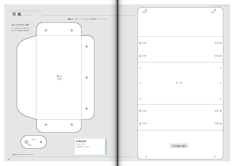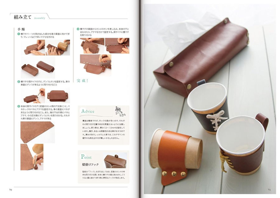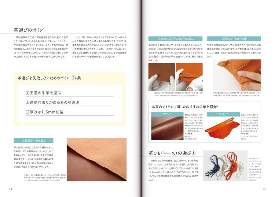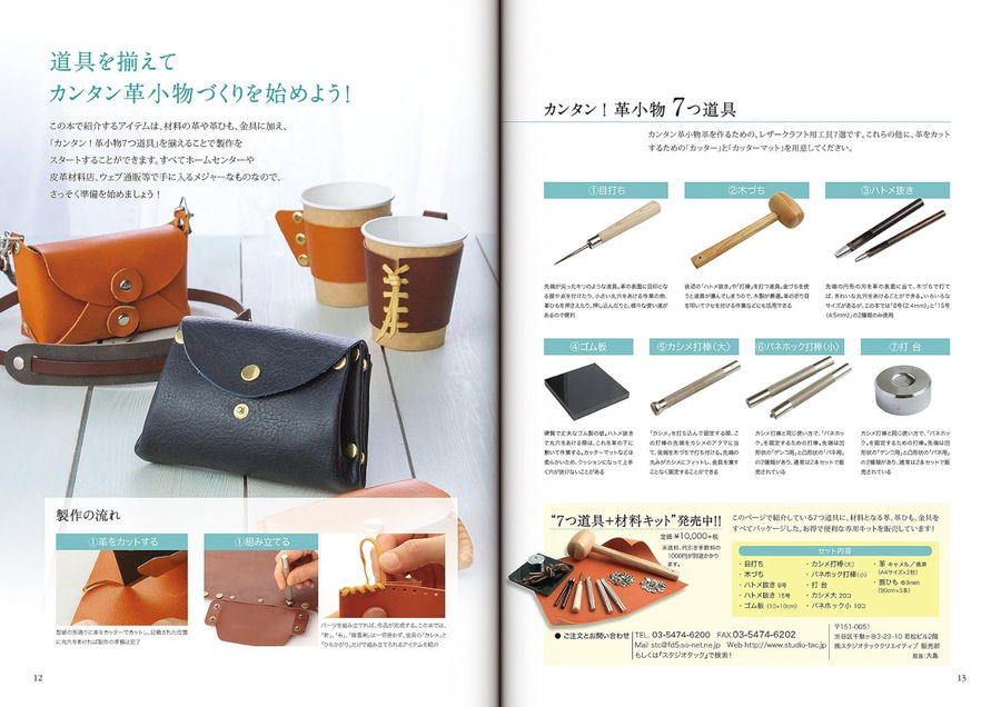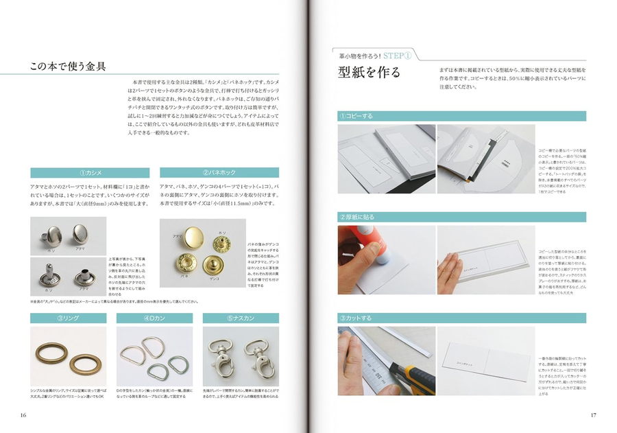 本書で組み立てに使うテクニックは、金具を木づちで打ち付けて固定する「カシメ」と、革にあけた穴を「革ひも」で編むようにつなげる「ひもかがり」のみです。