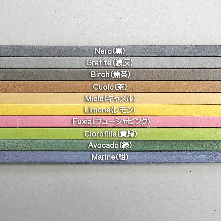 ヌメ革への染料染色では難しいとされている濁りのないパステルカラーを得意とする「TEMPESTI(テンペスティ)」社製のフルベジタブルレザーです。肌理が細かい北欧産の成牛原皮を用いて植物タンニンで丁寧に鞣され、適度な油脂分を加えることでヌメ革ならではのコシがあり芯材を用いない製品作りにも適しています。本素材は表面がホワイトワックスで覆われており、新品時は白味がかった柔らかな色合いとなっていますが、これを拭き取ると自然な艶とともに本来の彩度による美しい色味が現れ、使用が進むとさらに艶深くエイジングします。
