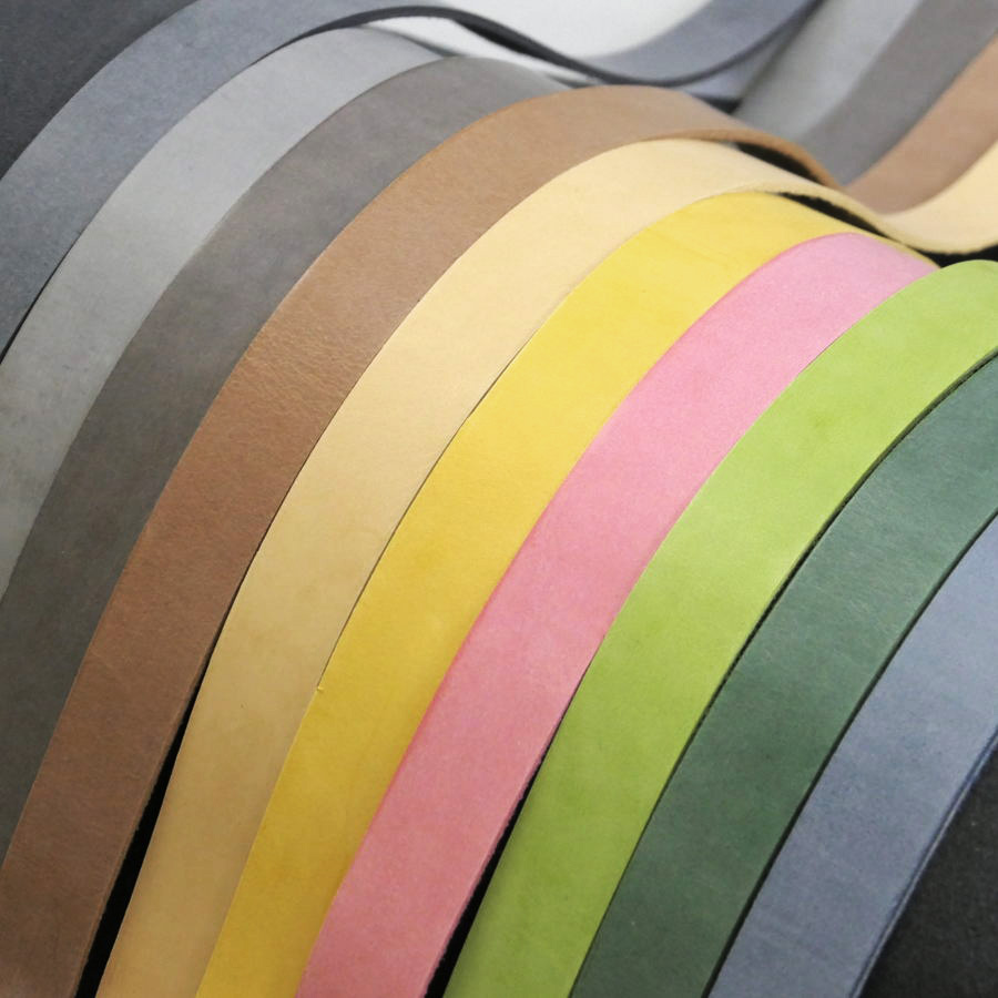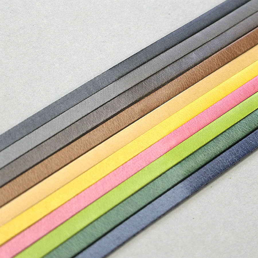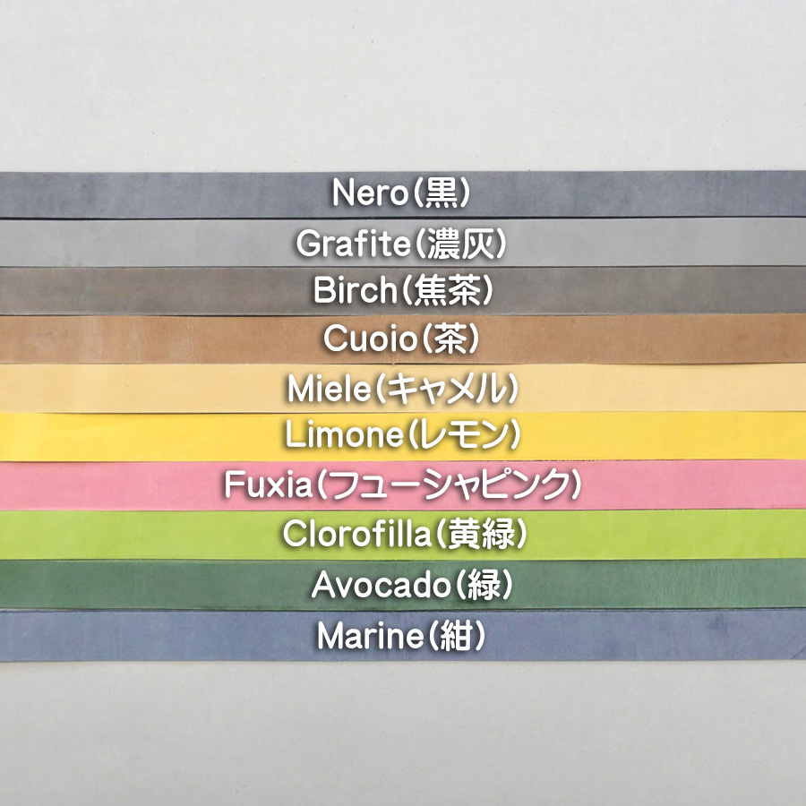 ヌメ革への染料染色では難しいとされている濁りのないパステルカラーを得意とする「TEMPESTI(テンペスティ)」社製のフルベジタブルレザーです。肌理が細かい北欧産の成牛原皮を用いて植物タンニンで丁寧に鞣され、適度な油脂分を加えることでヌメ革ならではのコシがあり芯材を用いない製品作りにも適しています。本素材は表面がホワイトワックスで覆われており、新品時は白味がかった柔らかな色合いとなっていますが、これを拭き取ると自然な艶とともに本来の彩度による美しい色味が現れ、使用が進むとさらに艶深くエイジングします。