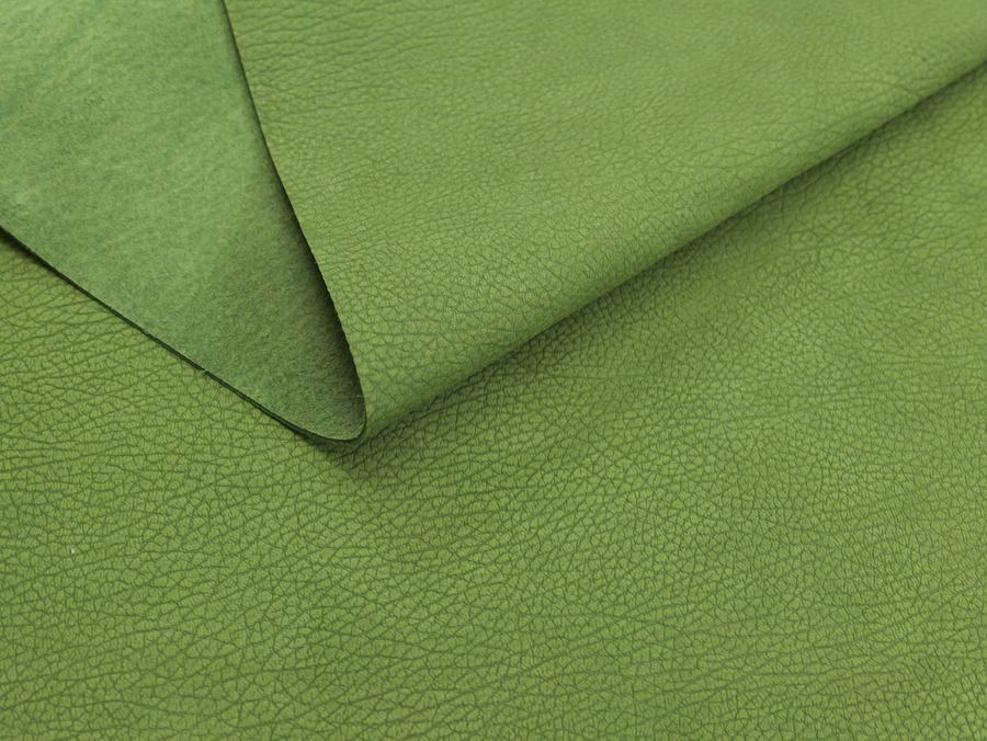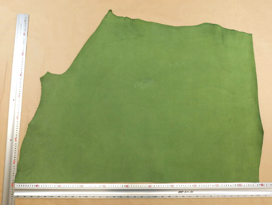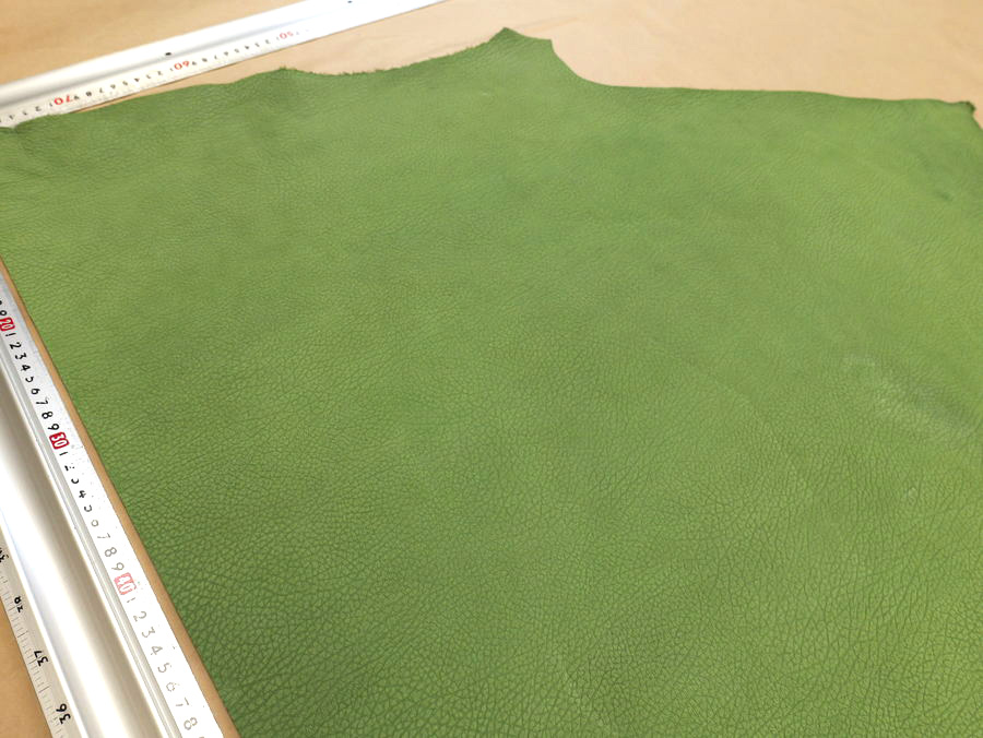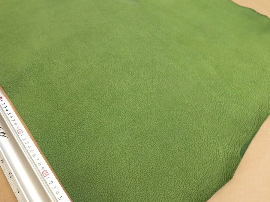 このCURARO(クラーロ)は独自の研究開発によりフルベジタブルなめしでは難度の高いパステル染色とくったりとした柔らかさの両立を実現し、表面はエレファント調のシボを型押しした後にバフを掛けることでヌバックなタッチに仕上げられています。床面はスエード調に起毛処理されていますので漉かずに1枚革で仕立てる用途にもお勧めです。