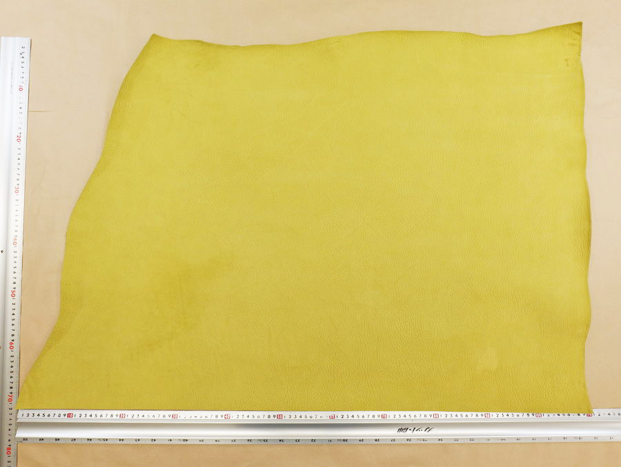 このCURARO(クラーロ)は独自の研究開発によりフルベジタブルなめしでは難度の高いパステル染色とくったりとした柔らかさの両立を実現し、表面はエレファント調のシボを型押しした後にバフを掛けることでヌバックなタッチに仕上げられています。床面はスエード調に起毛処理されていますので漉かずに1枚革で仕立てる用途にもお勧めです。