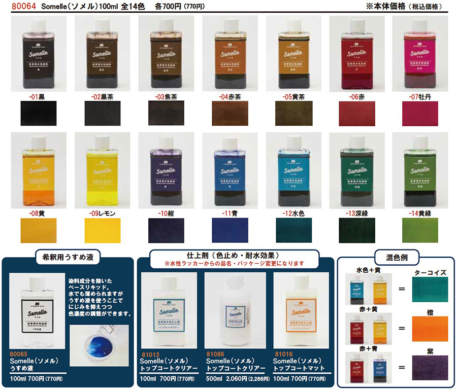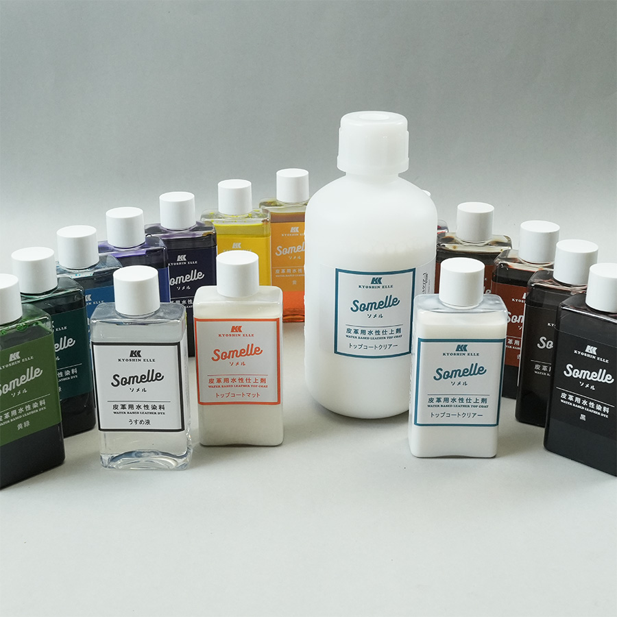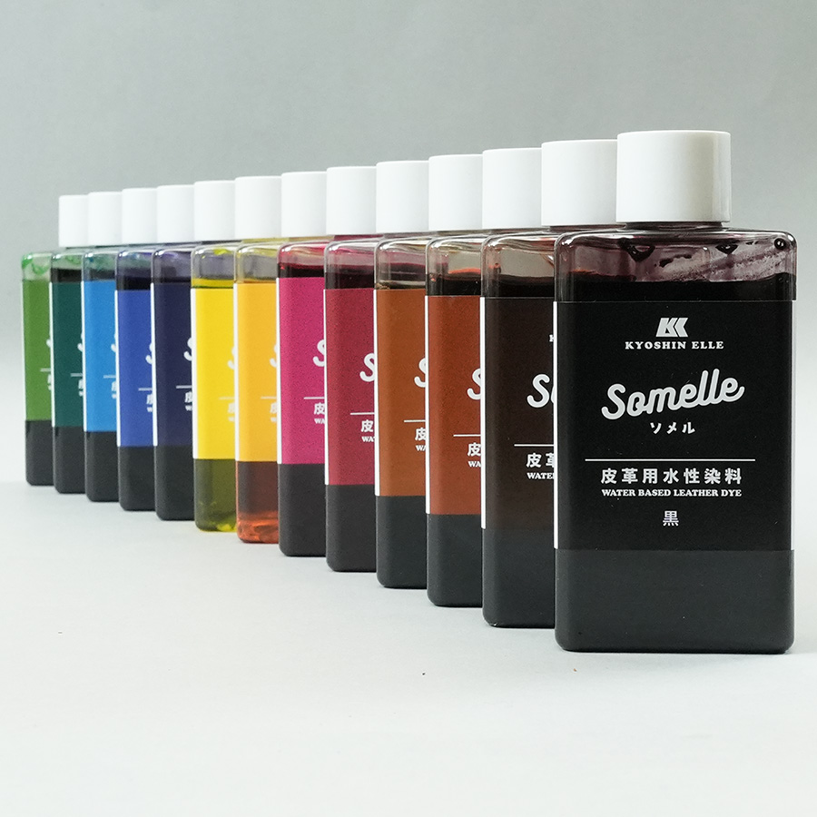 ヌメ革用水性液体染料「Somelle(ソメル)」はタンローなど表面コートされていないヌメ革を好みの色に染めることができる半透過液体染料です。