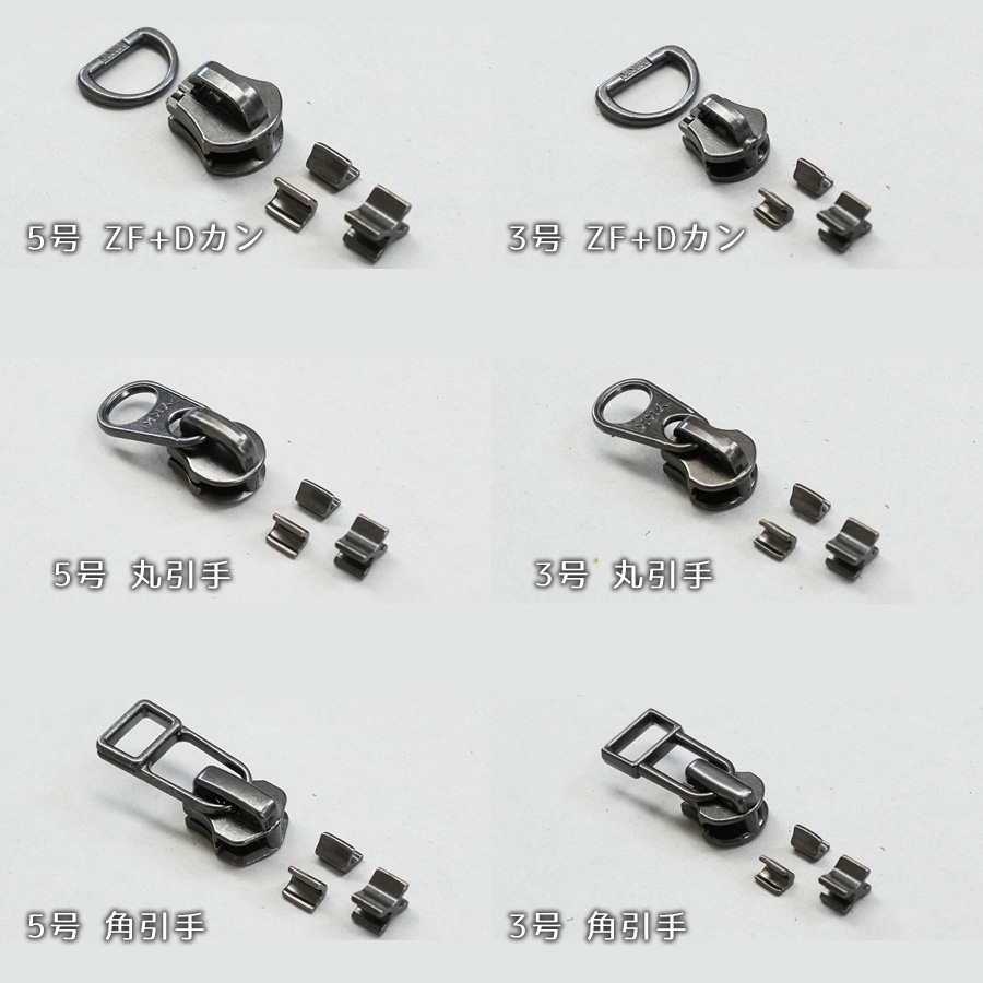 ■スライダーは3号、5号とも丸引手、角引手、ZF+Dカンの3種があり、スライダー1個につき上止め1組と下止め1個が付属します。