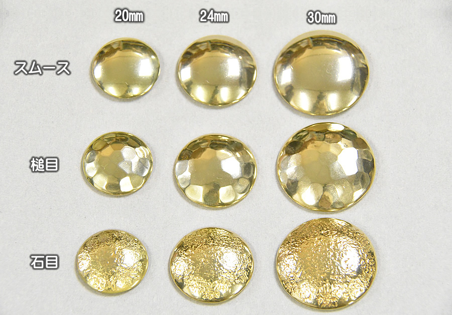 真鍮素材のコンチョです。コイン並に重量感のある1.5mm厚、槌目と石目はどちらも手打ちですので1個ごとに微妙に表情が違う1点物です。