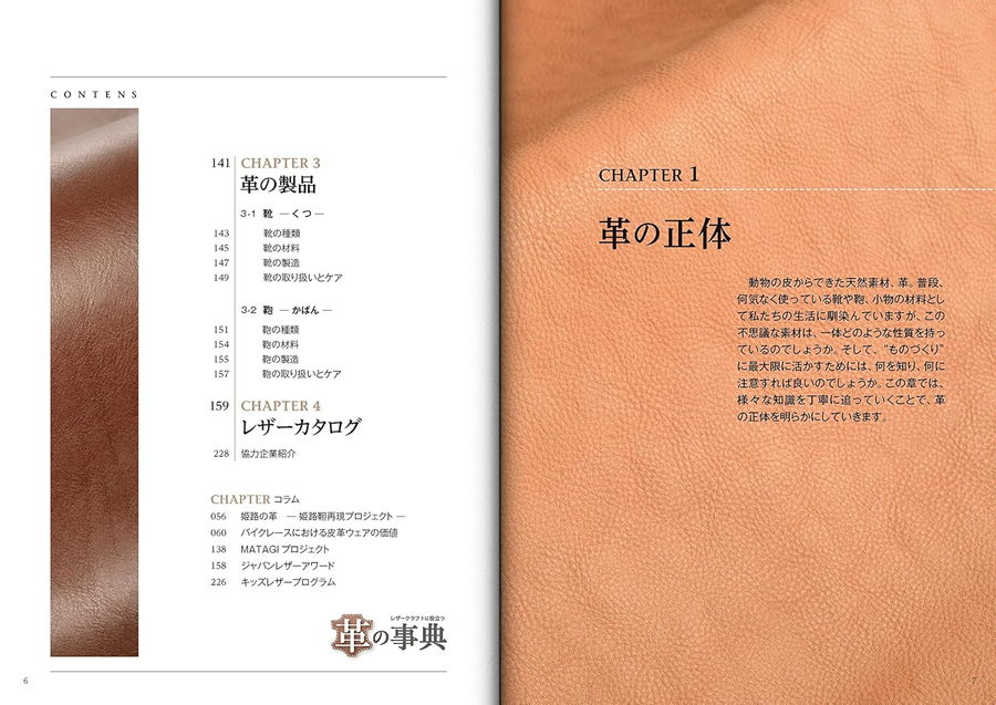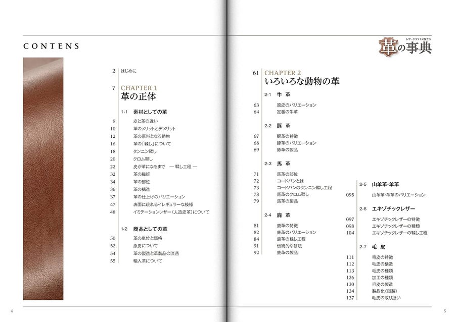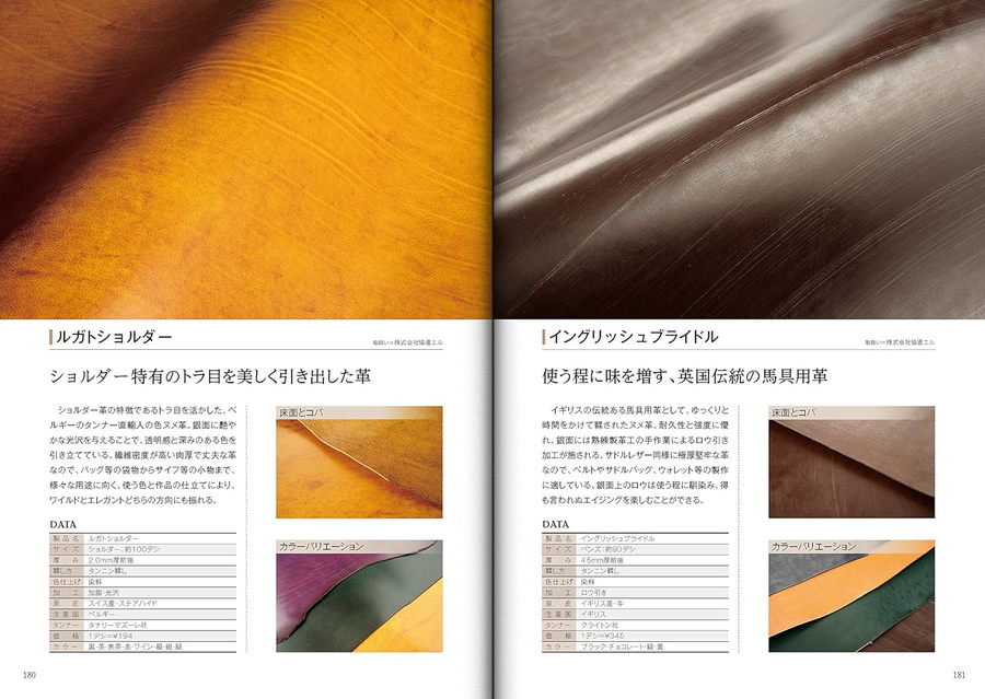 巻末には、90種類以上にも及ぶ皮革を掲載する「レザーカタログ」を掲載。