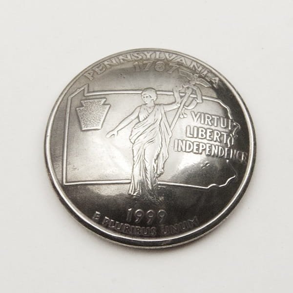 図柄:女神像と州の輪郭,州の輪郭の左上部にキーストンの象徴